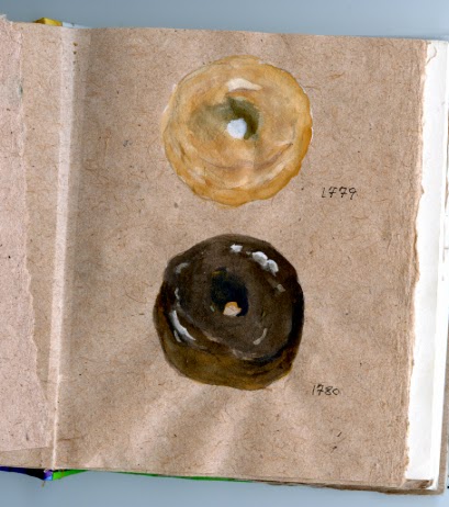 So the solution, and the answer to Bob's question, is that they sold us donuts and milk from the candy counter, around the corner from the place where lunches came out. We were crazed and also faint with hunger, the donuts were cheap, and I for one bought as many as I could carry. Here, drawn from memory, were the kinds of donuts we bought: at the top is a Plain, which was a vanilla glazed fried donut, not to be confused with a frosted donut. At the bottom, my favorite, is a Chocolate, which was the deep brown--almost purplish black-- version of the Plain, with little translucent flakes of fried sugar crusting the surface in a very pleasing way.