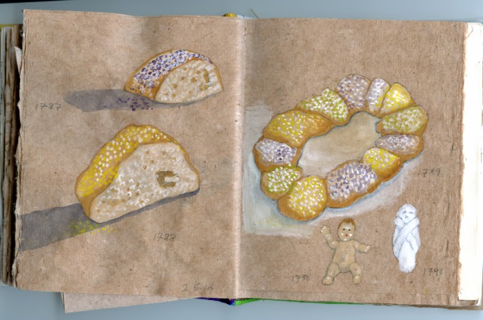 My brother Richard wrote last night saying that he didn't have any memories of donuts at school on First Fridays, but that he remembered King Cakes. So this post is for him. He mentioned the authentic king cakes, the ones that came from McKenzie's bakery, and he is absolutely right. There are many pretenders, but most of them are a case of what my mother would have called gilding the lily-- ruining a good thing by overdoing it. I was cautiously excited when I saw a boxed cake at our Whole Foods a couple of years ago that had a label that said King Cake. But the cake turned out to be heavily frosted with gloppy white sugar frosting and with sprinkles scattered over it, far too rich to eat as often as we ate king cake, which was for some of us almost daily during the season between Twelfth Night and Mardi Gras.