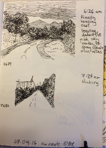 I hatched a plan to help the eight road hours go by: every hour I would draw what I could see as we headed east. These first nine quick quick sketches are bumpy-road speed drawings.