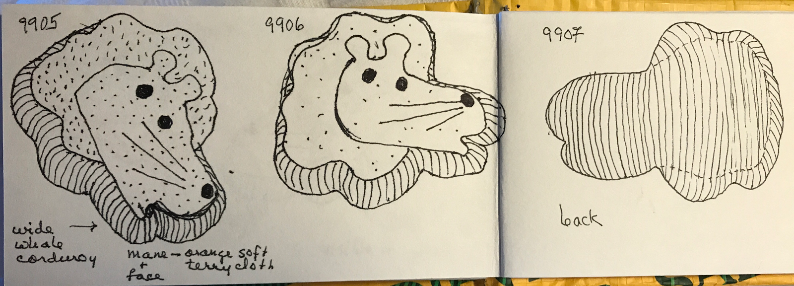 Nate has lost his beloved lion pillow from babyhood. He and his Dad are describing it and have sent a photo of it (partly obscured by Nate's head). These are the drawings I am sending to them for feedback so I can make a replacement.